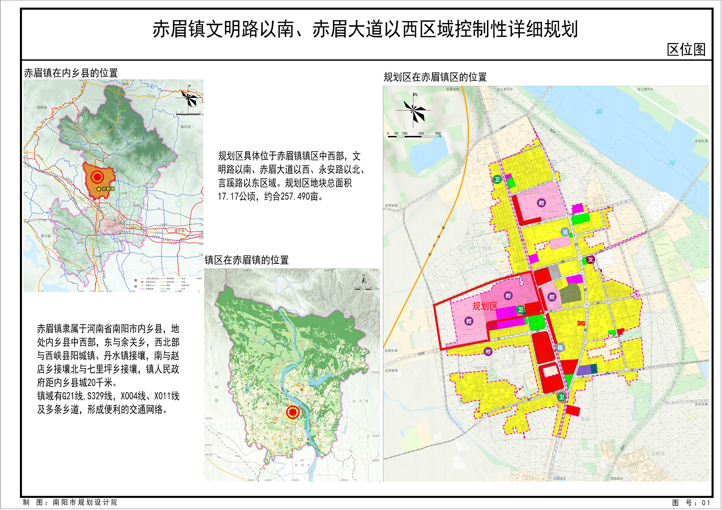 规划区位于内乡县赤眉镇言蹊路以东、文明路以南、赤眉大道以西、永安路和振兴路以北区域,规划总用地面积为17.17公顷(约合257.490亩)。规划方案充分落实上位规划和相关规范要求,能够满足用地使用需求,为该区域建设活动提供依据和遵循。